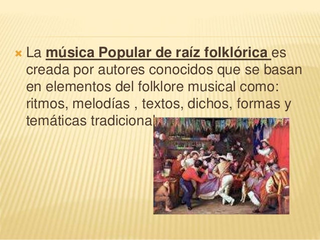 Nos referimos con este tipo de música a aquella que posee de la transmisión oral de siglos en continentes como Europa o América.Al contrario de la música culta,la folklórica nace para acompañar actividades cotidianas o acontecimientos especiales(la siembra y la recolección